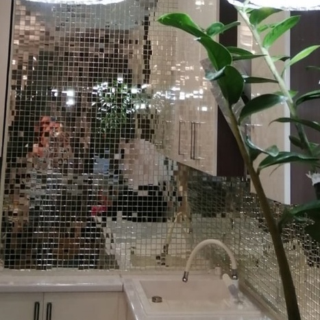 Использована серебристая квадратная зеркальная плитка размером 18х18.